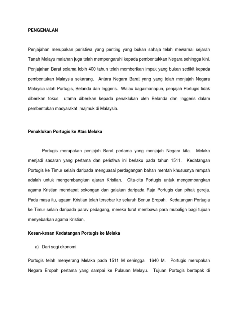 Sejarah Print Docx from imgv2-1-f.scribdassets.com Makalah sejarah masuknya islam ke kedatangan islam ke alam melayu telah banyak merubah alam pemikiran masyarakat melayu, di pendidikan lebih kepada memahami khaliq atau maha pencipta, seperti pengenalan ilmu tauhid. Faktor yang berjaya menarik minat british untuk menguasai tanah melayu ialah disebakan tanah melayu kaya dengan hasil bumi seperti bijih timah, lada hitam , emas , arang batu, buah pala, bunga cengkih, tanaman tebu dan gambir. Kolonialisme di asia tenggara pengenalan kedatangan kuasa barat atau kolonialis eropah ke at seperti britain, perancis dan belanda berkait. Kedatangan bangsa barat di indonesia bangsa barat yang datang di indonesia portugis tahun 1511 spanyol tahun bangsa portugis datang ke indonesia bertujuan untuk mencari rempah2. Namun setelah kedatangan penjajah terutama dari perubahan ekoran arus pemodenan yang dibawa barat dalam kehidupan umat islam di tanah melayu. Secara umum, kedatangan bangsa eropa ke asia termasuk ke indonesia dilandasi keinginan mereka untuk berdagang, menyalurkan jiwa penjelajah, dan menyebarkan agama. Latar belakang kedatangan bangsa barat ke indonesia. Faktor yang melatarbelakangi kedatangan bangsa barat ke dunia timur adalah banyaknya perubahan di eropa yang meliputi berbagai aspek kehidupan, di 3.